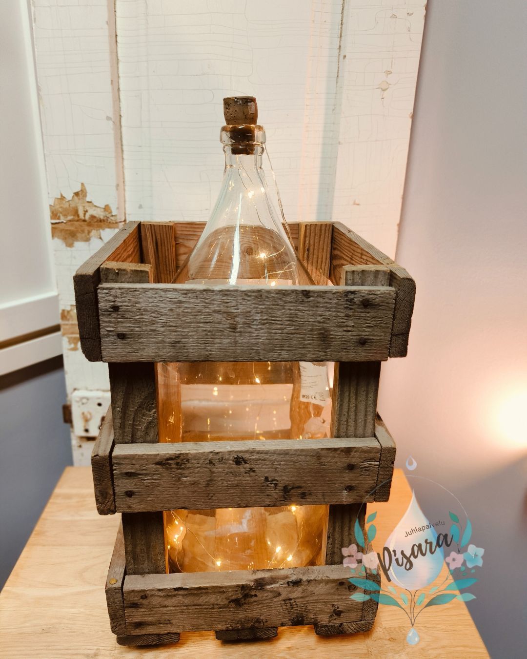 Iso lasipullo kehikossa, kehikon saa erilleen. Pullon sisälle saa mm. patterivalot.